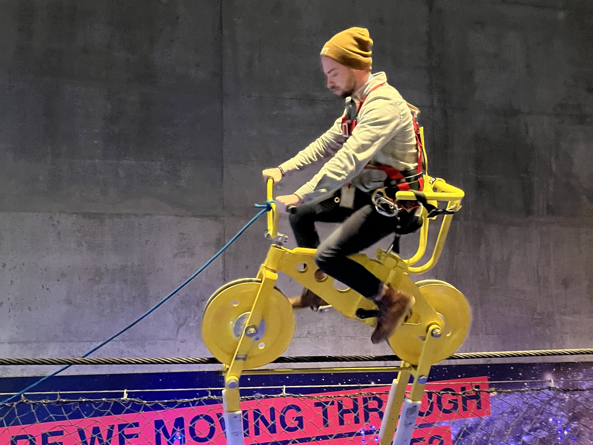 - Cyclists must physically fit into the SkyCycle harness