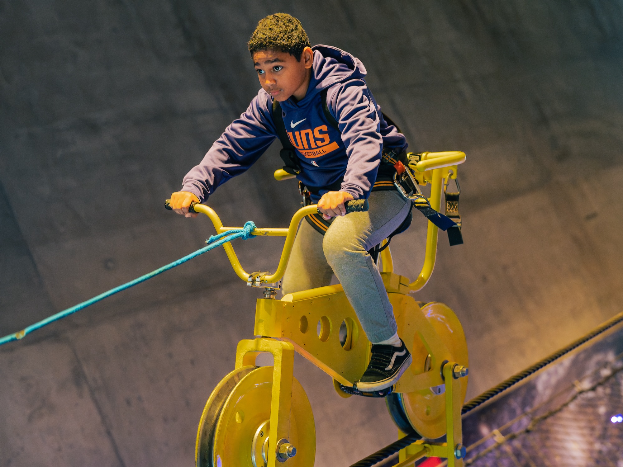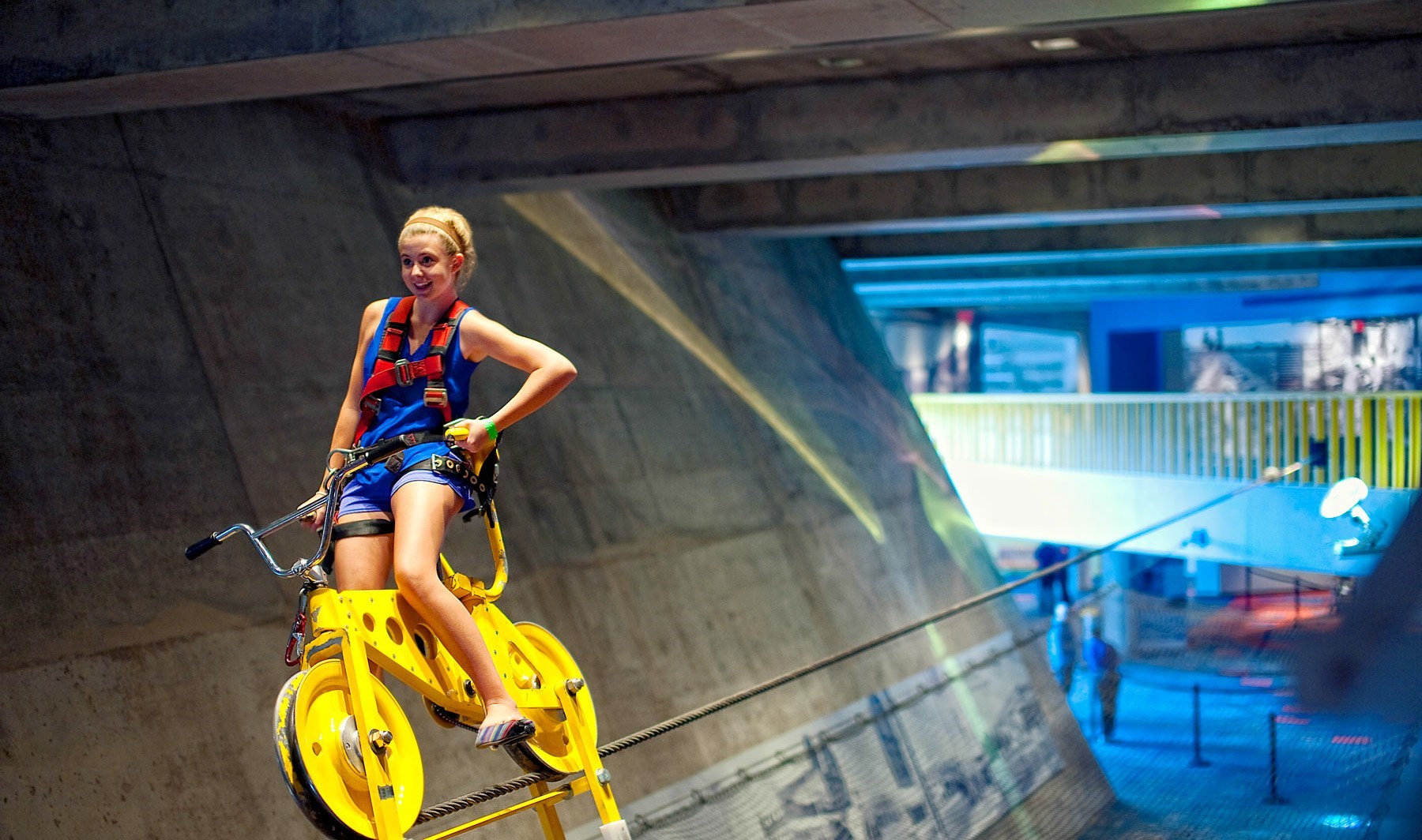 Suspended nearly 15 feet in the air, the Evans Family SkyCycle teaches riders about the principles of counterbalance and center of gravity, while taking a ride on the 90-foot cable.